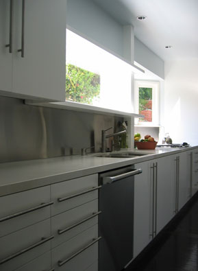 A minimal color palette (white, gray, stainless steel) is a backdrop that is easily accented with colorful kitchen items.